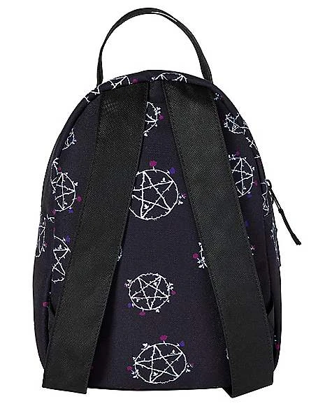 Strap up with bold style and take on the day with this Pentagram Mini Backpack! This sleek backpack is stylized with pentagrams and roses and features two outside zipper pockets. For the perfect touch of edgy flair, this backpack is sure to get the job done.