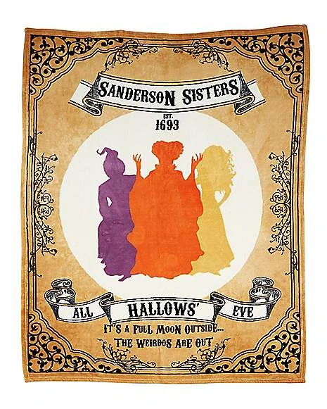 The Sanderson Sisters have returned this Halloween, but this time they’ve conjured up something cozy! This soft, fleece blanket features the silhouettes three Sanderson sisters wearing their signature colors, surrounded with intricate black patterning over a tan background. Adorned with a classic quote from the movie, this is the perfect addition to the home of any Hocus Pocus fan!